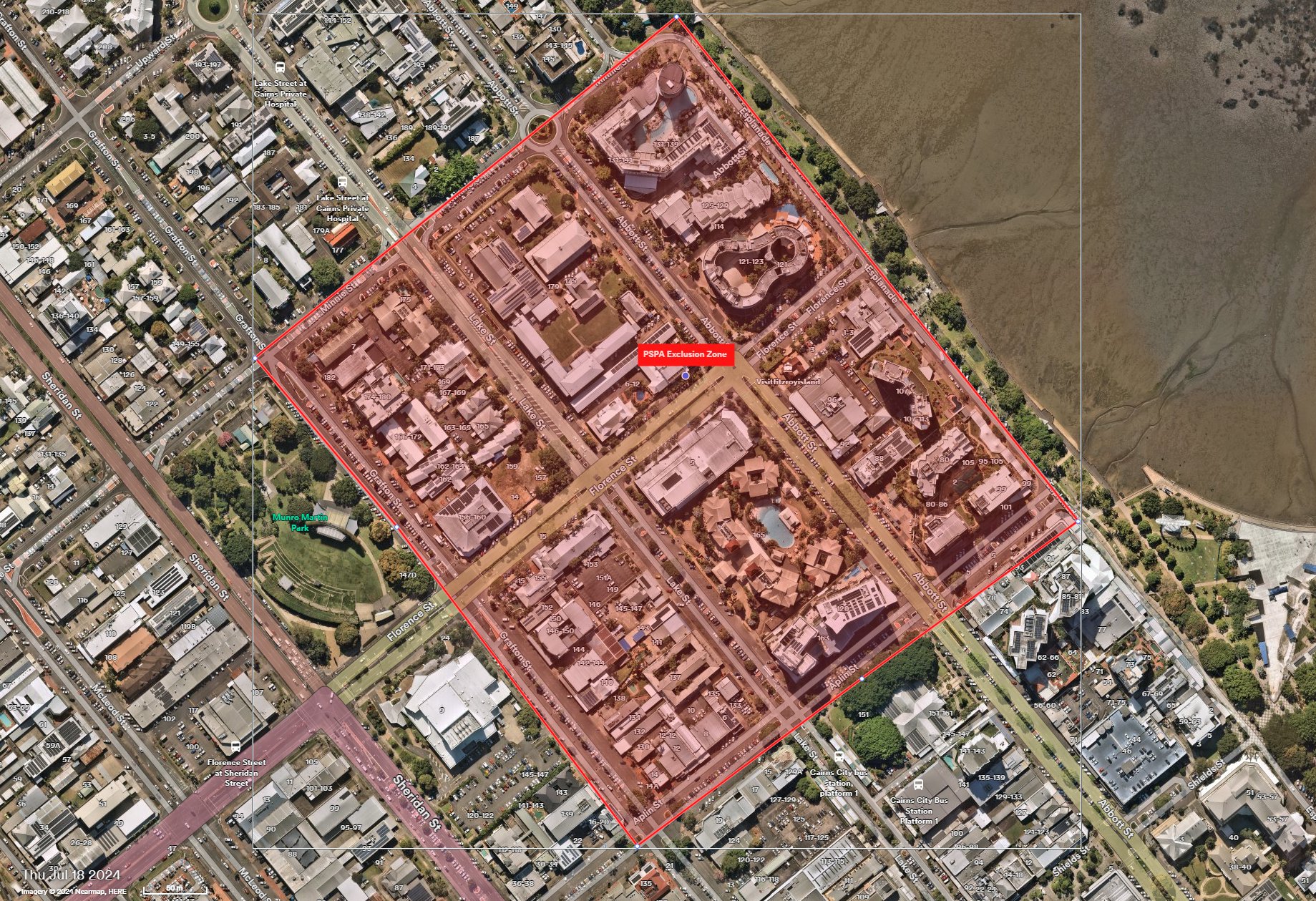 The PSPA has an exclusion zone encompassing Esplanade, Minnie Street, Aplin Street, and Grafton Street.https://t.co/hvOb5zkWS3 pic.twitter.com/LOgkpWrVPe