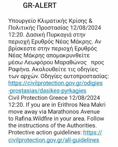 Νέο μήνυμα από το 112 εστάλη αυτή τη φορά στους κατοίκους στην περιοχή Ερυθρός που βρίσκεται στη Νέα Μάκρη.