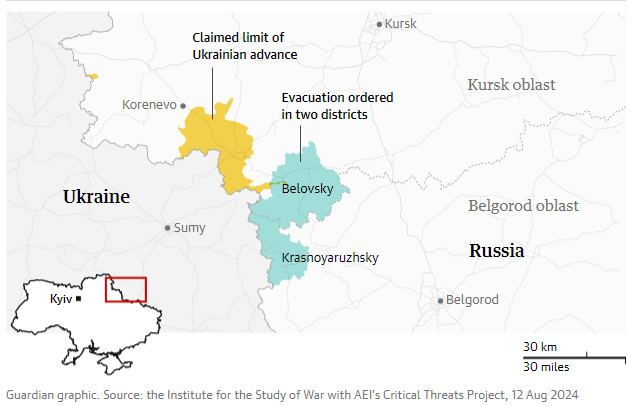 Παρά τους ισχυρισμούς Ρώσων στρατιωτικών μπλόγκερ την Κυριακή ότι η κατάσταση είχε σταθεροποιηθεί, αναφέρθηκαν νέες εισβολές στο δυτικό Κουρσκ, βορειοδυτικά της ουκρανικής πόλης Σούμι, σημειώνει ο Guardian.