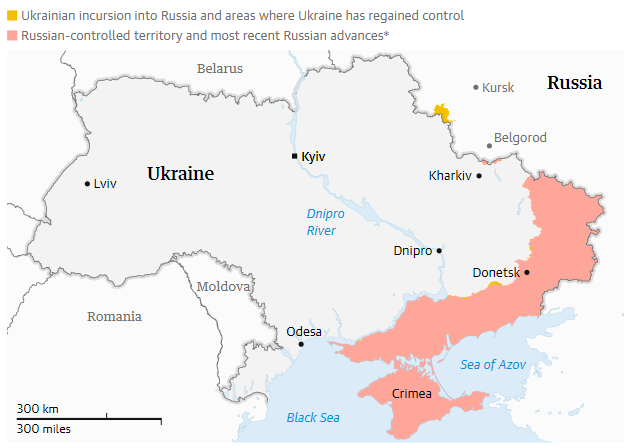 Με το κίτρινο η ουκρανική εισβολή στη Ρωσία. Με το ροζ οι περιοχές που ελέγχει η Ρωσία. Πηγή: Guardian / ISW / CTP