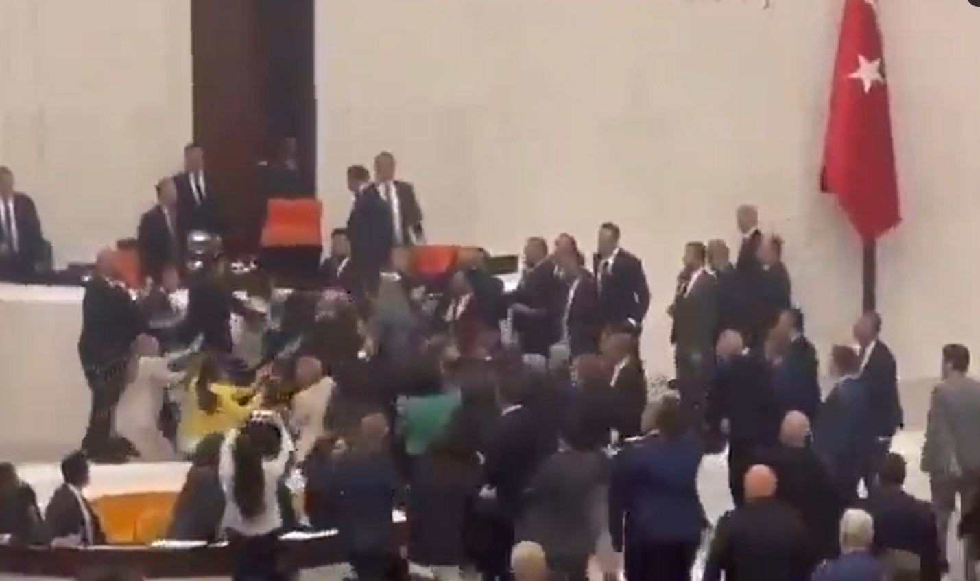 Κατόπιν τούτου βουλευτές του AKP σηκώθηκαν και επιτέθηκαν κατά του βουλευτή του ΤΙΡ. Ακολούθησε πανδαιμόνιο και ο βουλευτής Σμύρνης του ΑΚΡ, Αλπάι Όζαλαν, γρονθοκόπησε τον Σικ. Στα επεισόδια που σημειώθηκαν τραυματίστηκε μία βουλευτής του φιλοκουρδικού Κόμματος της Ισότητας και της Δημοκρατίας των Λαών (DEM), η Γκιουλιστάν Κιλίτς Κότσγιγίτ, η οποία μεταφέρθηκε αρχικά στο ιατρείο του Κοινοβουλίου και στη συνέχεια σε νοσοκομείο. Τραυματίστηκε επίσης και ο βουλευτής του CHP Οκάν Κορούναλπ. Η συνεδρίαση της Ολομέλεια διεκόπη και πάλι για 45 λεπτά.