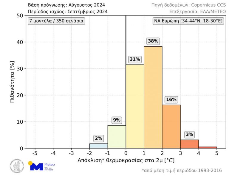 Σύμφωνα με το 89% των διαθέσιμων σεναρίων η μέση θερμοκρασία Σεπτεμβρίου θα είναι υψηλότερη από τα κανονικά για την εποχή επίπεδα (περίοδος αναφοράς: 1993-2016). Πιο συγκεκριμένα, τα πιθανότερα σενάρια είναι να σημειωθούν αποκλίσεις της τάξης των 1-2°C (38%) και 0-1°C (31%), ενώ η πιθανότητα για μέσες θερμοκρασιακές αποκλίσεις άνω των 2°C είναι περίπου 19%. Τέλος, υπάρχει 11% πιθανότητα να έχουμε χαμηλότερη του κανονικού μέση θερμοκρασία.