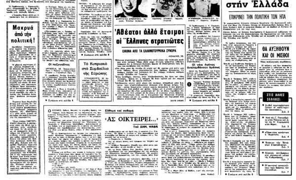 Τι γίνεται, όμως, με τον κ. Κίσσινγκερ; Ο «ατσίδας» αυτός ασκεί μια χονδροειδέστατη διπλωματία, όπου κρίνεται περιττή πολυτέλεια το στοιχείο της ντροπής. Αυτό, όμως, έως τώρα. Από δω και πέρα —τόδειξε η Κυβέρνησή μας— ξέρει και η Ελλάδα πώς θα φέρνεται. Δόξα Σοι ο Πανάγαθος Θεός, έγινε μια θαυμάσια αρχή με την απάντηση του κ. Καραμανλή στην πρόσκληση του κ. Κίσσινγκερ.