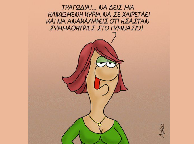 «Τραγωδία!… Να δεις μια ηλικιωμένη κυρία να σε χαιρετάει και να ανακαλύψεις ότι ήσασταν συμμαθήτριες στο γυμνάσιο!» αναφέρει χαρακτηριστικά ο χαρακτήρας του Αρκά.