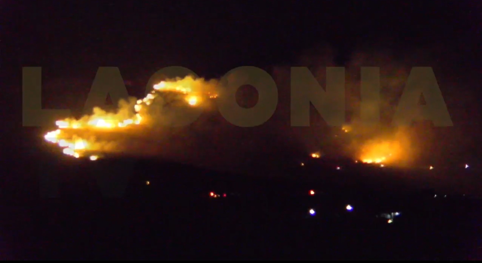 Μάχη με τις φλόγες δίνουν πλέον μοναχά επίγειες δυνάμεις, καθώς στις 21:00 αποσύρθηκαν τα εναέρια μέσα. Αυτήν τη στιγμή επιχειρούν 52 πυροσβέστες με 11 οχήματα και τρεις ομάδες πεζοπόρων τμημάτων. Στο ακόλουθο βίντεο, του Laconiatv, φαίνεται η έκταση που έχει το μέτωπο της φωτιάς.