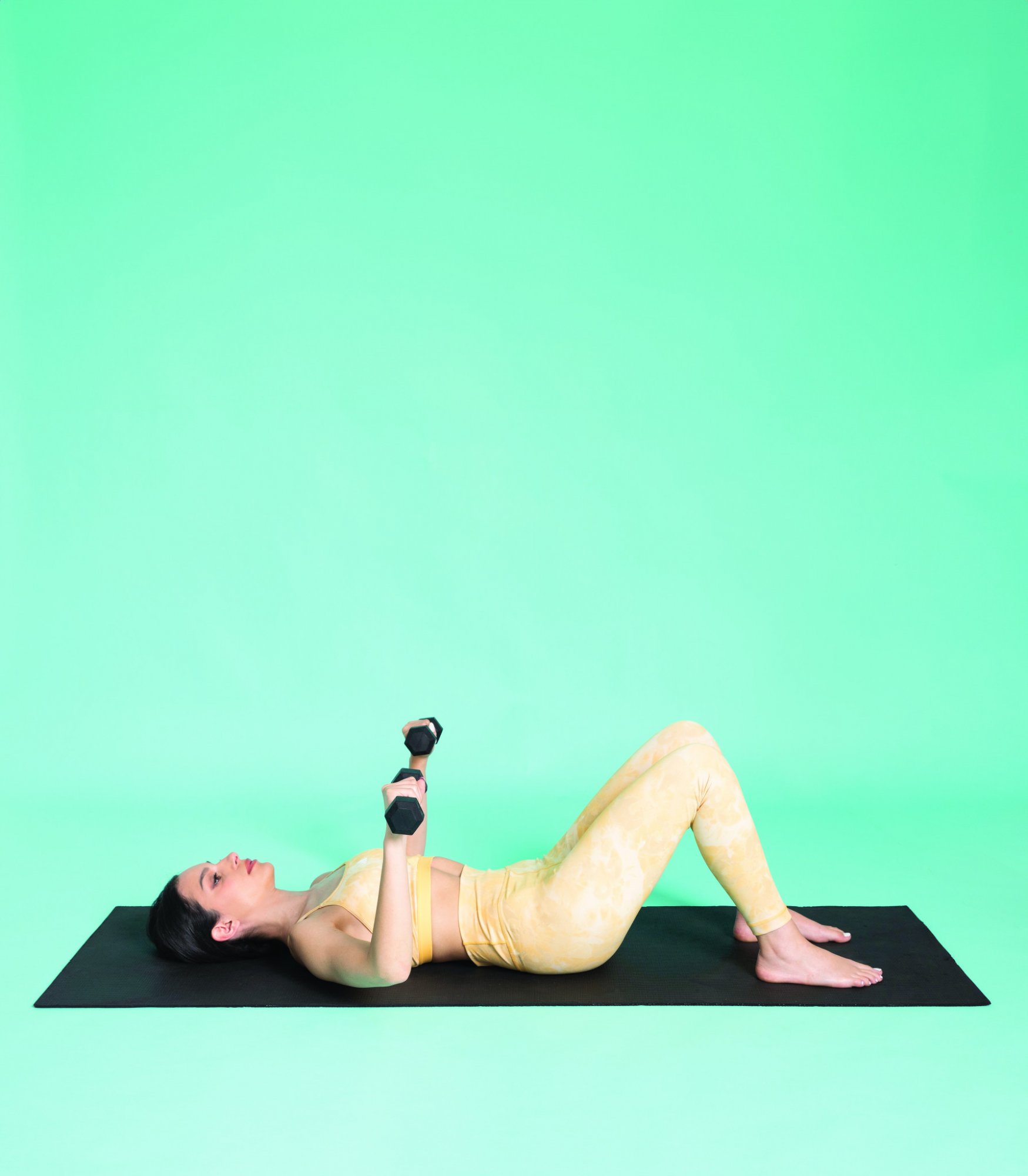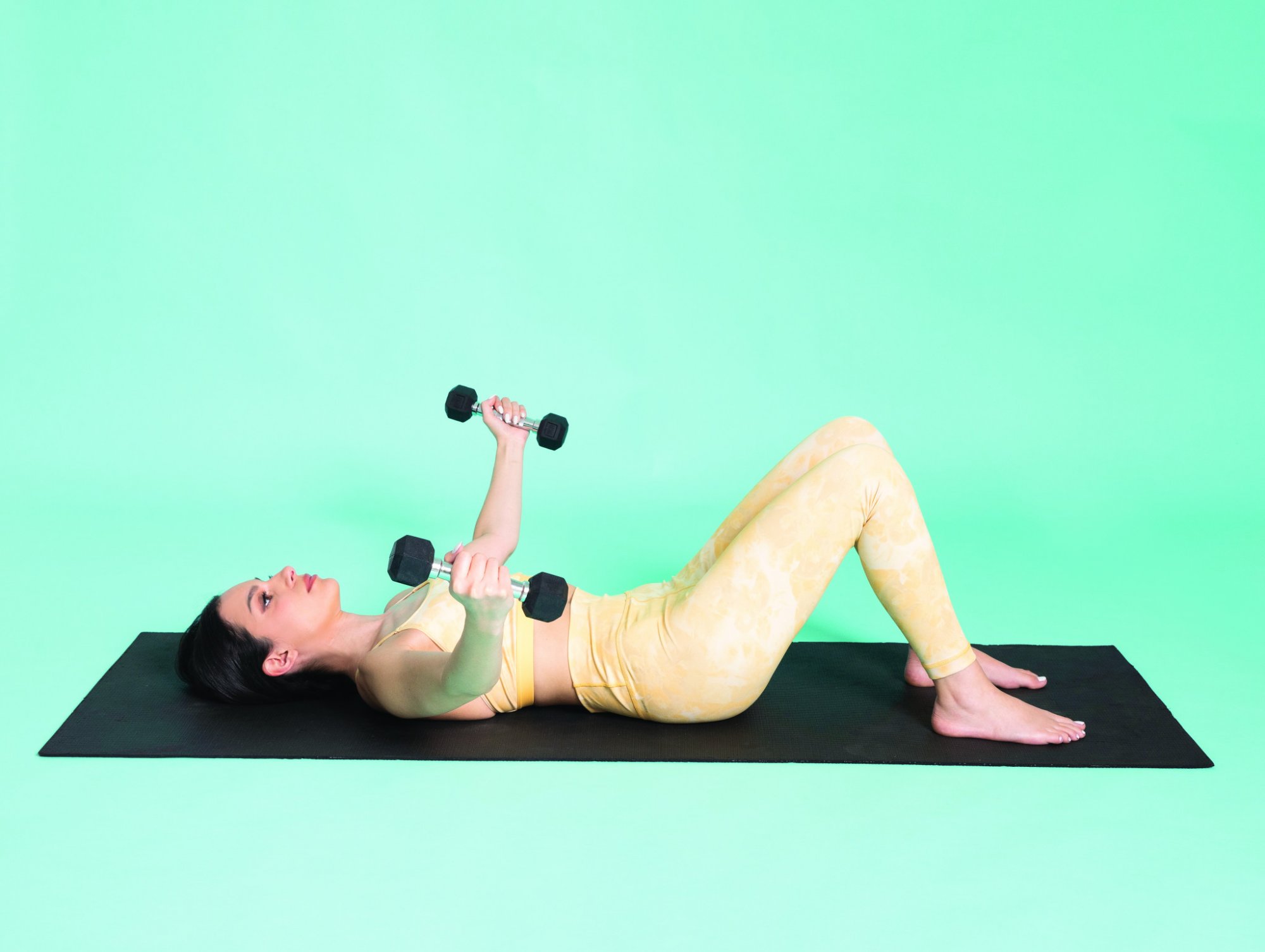 Ξαπλώνουμε ανάσκελα στο πάτωμα με τα γόνατα λυγισμένα και τα πέλματα να ακουμπούν σταθερά στο έδαφος. Κρατάμε έναν αλτήρα σε κάθε χέρι με τις παλάμες να κοιτούν προς τα εμπρός. Τοποθετούμε τα χέρια στα πλάγια του στήθους, με τους αγκώνες λυγισμένους σε γωνία 90 μοιρών. Πιέζουμε τους αλτήρες προς τα πάνω με εκπνοή, μέχρι τα χέρια να είναι πλήρως τεντωμένα, και στη συνέχεια κατεβάζουμε αργά στην αρχική θέση. Επαναλαμβάνουμε 15 φορές.