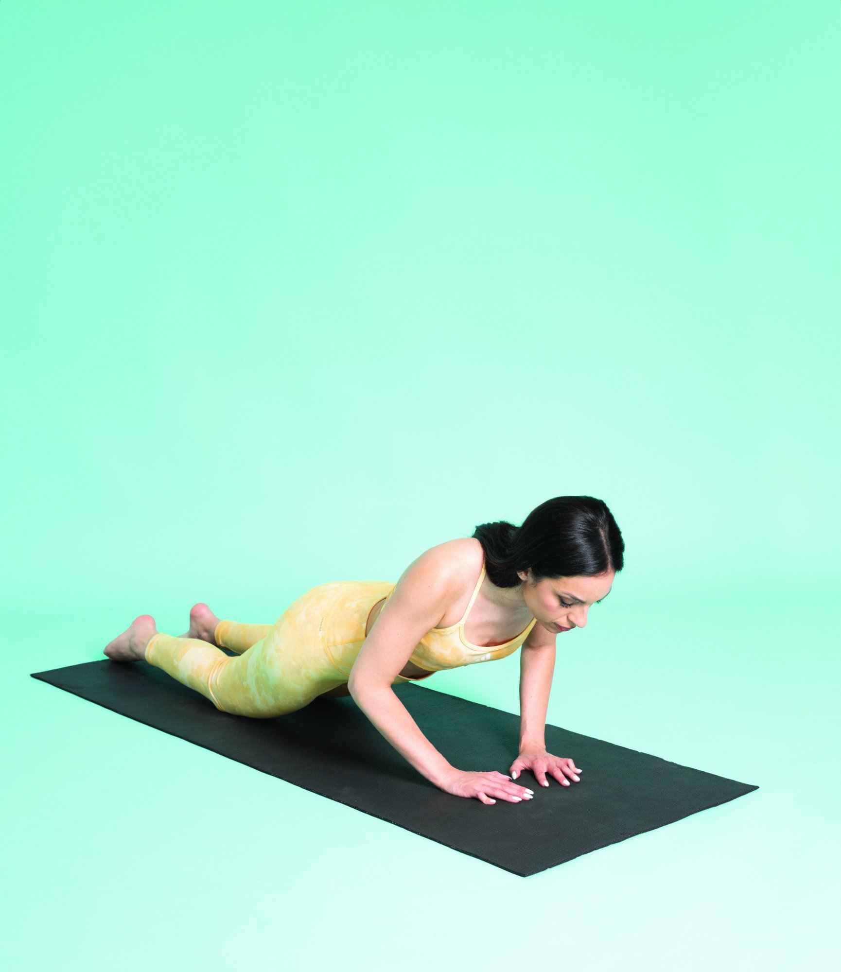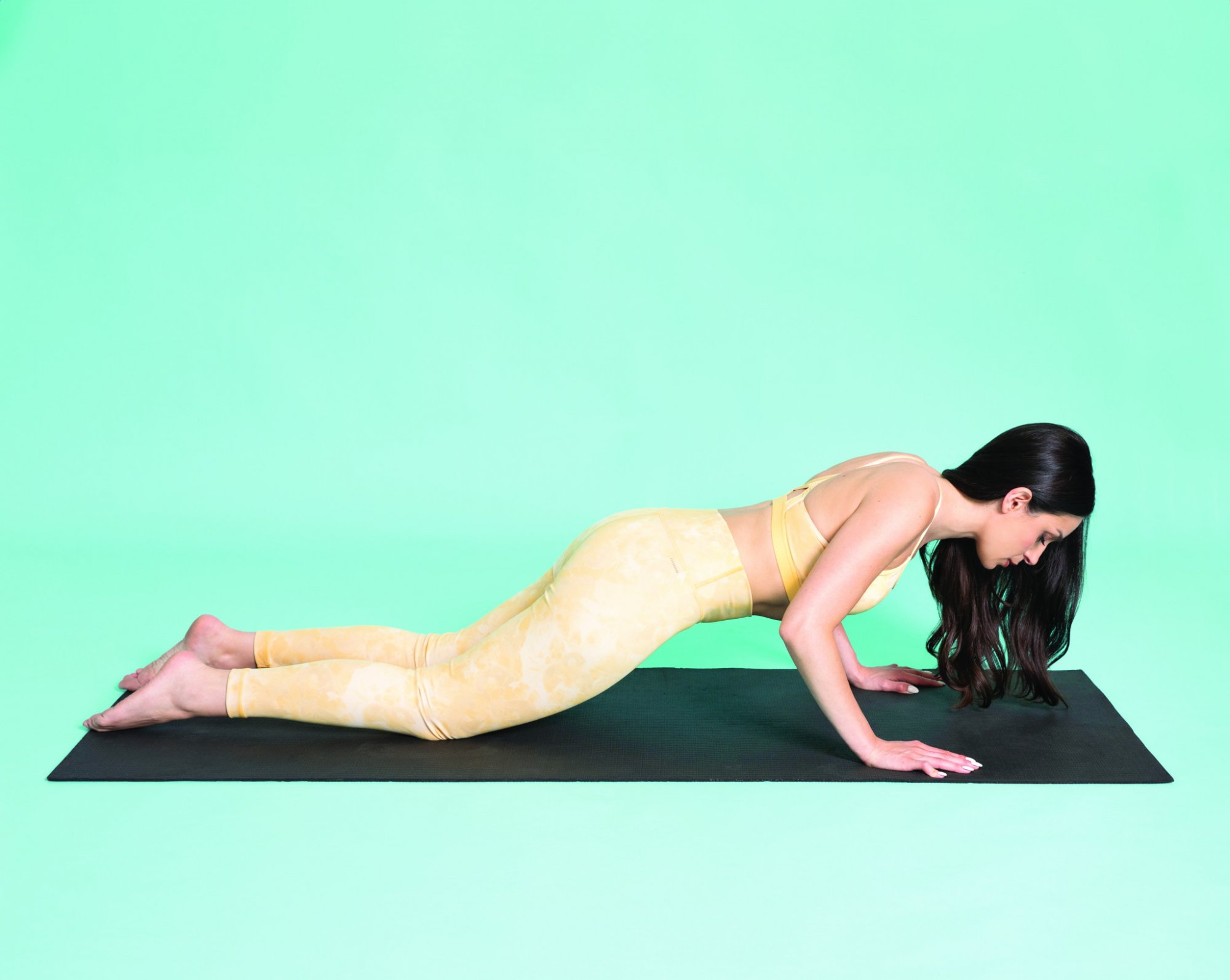 Ξεκινάμε στηριζόμενοι στα γόνατα και στις παλάμες, με τα χέρια τοποθετημένα λίγο πιο ανοιχτά από το πλάτος των ώμων. Κρατάμε τον κορμό σε ευθεία γραμμή από το κεφάλι μέχρι τα γόνατα, διατηρώντας μια ελαφρά οπίσθια κλίση στη λεκάνη. Το κεφάλι βρίσκεται στην προέκταση της σπονδυλικής μας στήλης. Λυγίζουμε τους αγκώνες με εισπνοή, κατεβάζοντας το στήθος προς το έδαφος, οι αγκώνες δείχνουν διαγώνια προς τα έξω. Πιέζουμε προς τα πάνω με εκπνοή για να επανέλθουμε στην αρχική θέση. Επαναλαμβάνουμε 10 φορές.