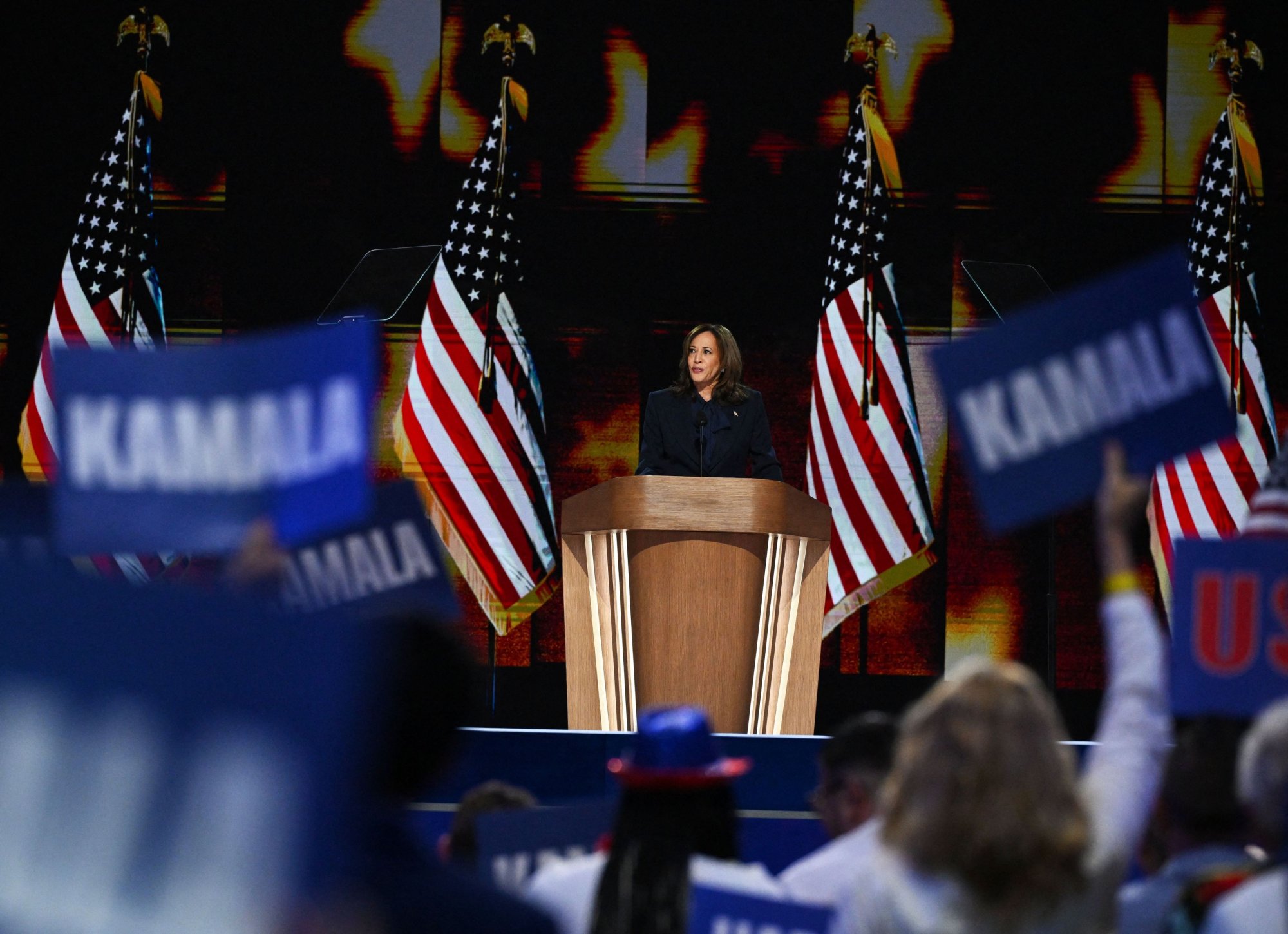 Η Κάμαλα Χάρις κατά τη διάρκεια της ομιλίας της στο συνέδριο των Δημοκρατικών στο Σικάγο