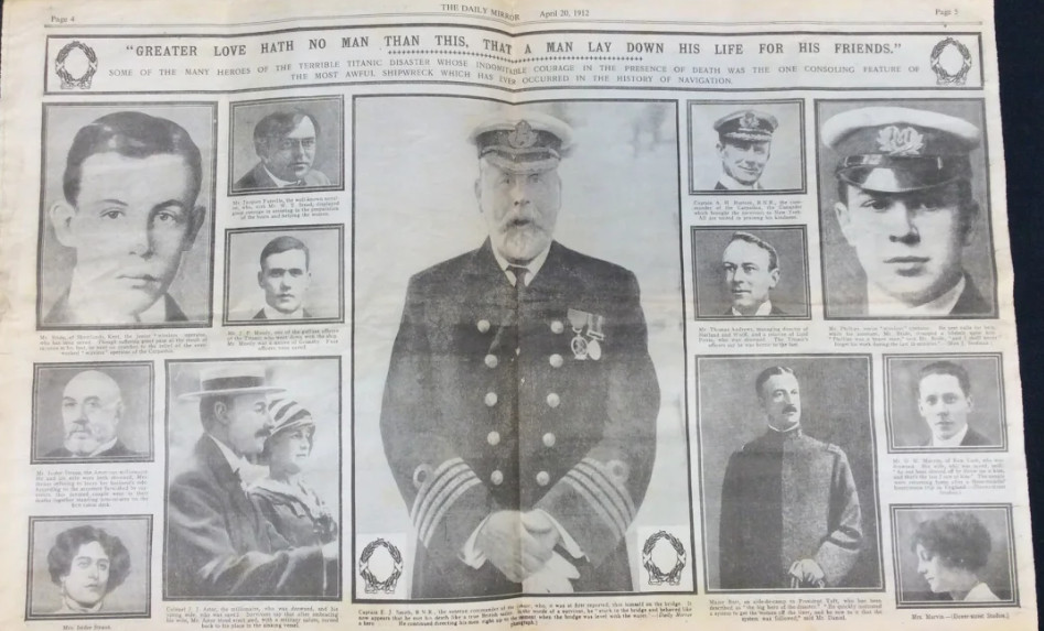 Με ημερομηνία 20 Απριλίου 1912, το πρωτοσέλιδο της βρετανικής εφημερίδας The Daily Mirror δείχνει δύο γυναίκες στο Σαουθάμπτον, το βρετανικό λιμάνι από όπου ξεκίνησε το ταξίδι του ο Τιτανικός, να περιμένουν να αποσταλεί ο κατάλογος των επιζώντων.
