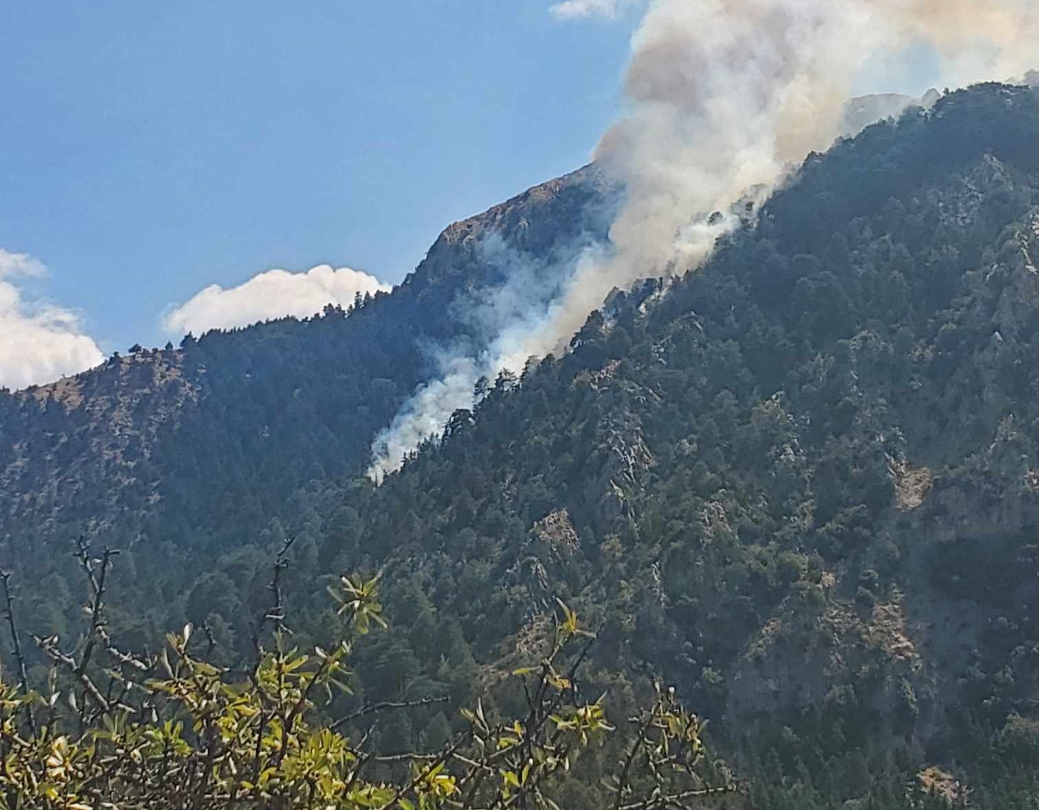 Η φωτιά καίει σε πολύ δύσβατες χαράδρες με πεύκα κάνοντας σχεδόν αδύνατη την πρόσβαση των επιγείων πυροσβεστικών δυνάμεων.