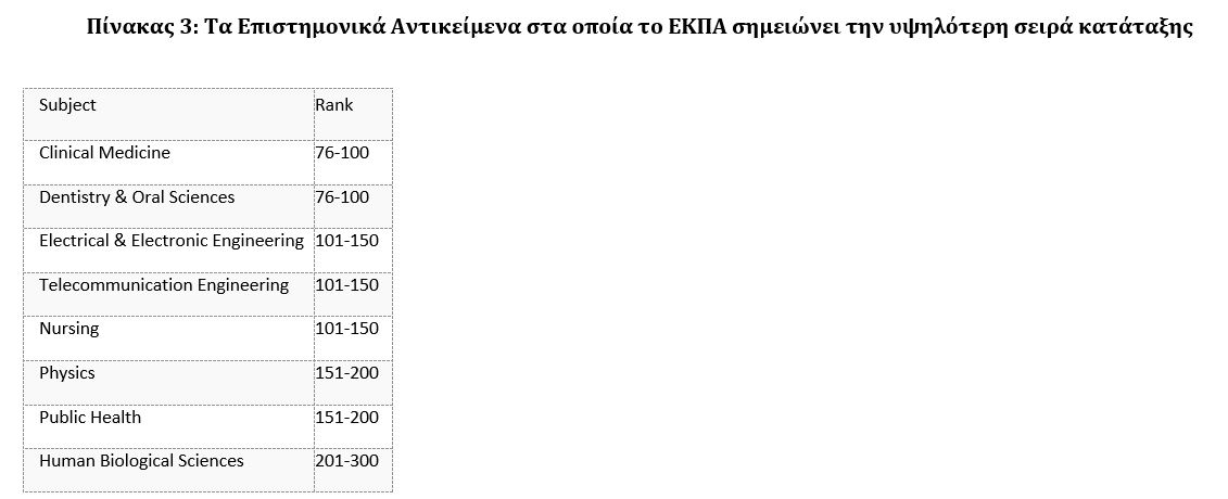 Ειδικότερα, όσον αφορά την κατάταξη με βάση τα Επιστημονικά Αντικείμενα (Academic Subjects), το ΕΚΠΑ βρίσκεται στις θέσεις 76-100 στα πεδία της Κλινικής Ιατρικής, και της Οδοντιατρικής, στις θέσεις 101-150 στα πεδία της Ηλεκτρολογικής και Ηλεκτρονικής Μηχανικής, Μηχανικής Τηλεπικοινωνιών, και της Νοσηλευτικής και στις θέσεις 151-200 στα πεδία της Φυσικής, της Δημόσιας Υγείας, και των Επιστημών της Βιολογίας του Ανθρώπου (Βλέπε Πίνακα 3):