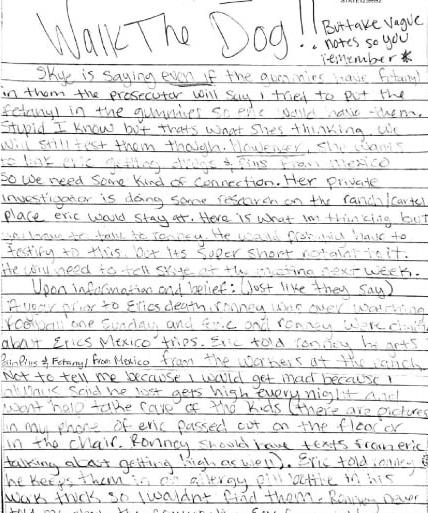 Το γράμμα που ονομάστηκε «Walk the dog», λόγω της εντολής που ήταν γραμμένη στο πάνω μέρος του, φαινόταν να δίνει εντολή στα μέλη της οικογένειας να καταθέσουν ψευδώς ότι ο κ. Richins είχε προμηθευτεί ναρκωτικά και χάπια από το Μεξικό.