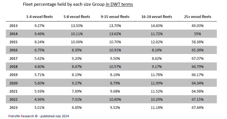 Αντιθέτως ο αριθμός των εταιρειών με στόλο μεγαλύτερο των 25 πλοίων αυξήθηκε σε 57 από 56 το 2022 και 54 το 2021 και μόλις 35 το 2013, σημειώνοντας τον υψηλότερο αριθμό που έχει καταγραφεί ποτέ. Από πλευράς χωρητικότητας η αύξηση ήταν για τις εν λόγω εταιρείες κατά 7,86 εκατ. dwt το 2023 σε σύγκριση με αύξηση 18,17 εκατ. dwt το 2022. Αξίζει επίσης να σημειωθεί ότι ο αριθμός των εταιρειών με στόλο 16-24 πλοίων ξεπέρασε για πρώτη φορά τις 40 όταν το 2013 ήταν μόλις 29.