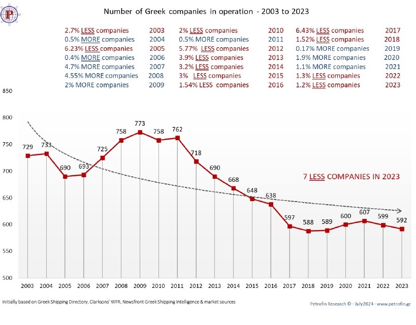 Ο αριθμός των ελληνικών ναυτιλιακών εταιρειών έχει μειωθεί και πάλι το 2023 σε 592, μια μικρή ανάσα από το ιστορικό χαμηλό των 588 το 2018, όταν το 2013 ήταν 690 και το 2009 άγγιξαν τον υψηλότερο αριθμό (773), ωστόσο ο ελληνόκτητος στόλος τo 2023 αυξήθηκε κατά 85 πλοία και 2% σε όρους μεταφορικής ικανότητας στα 6.494 πλοία. Με 393 εκατ. dwt μεταφορική ικανότητα εξακολουθούσε να κατέχει ένα άνετο προβάδισμα έναντι των 302 εκατ. dwt της Κίνας, με την Ιαπωνία να βρίσκεται στην τρίτη θέση με 238 εκατ. dwt.