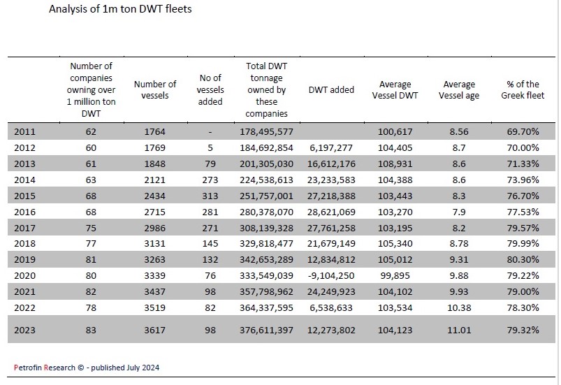 Οι πλοιοκτήτες με στόλο άνω του ενός εκατ. dwt αυξήθηκαν επίσης σε 83 έναντι 78 το 2022 και ελέγχουν το 79,3%, του συνολικού ελληνόκτητου στόλου, όταν το 2013 ο αριθμός των εταιρειών αυτού του μεγέθους ήταν 61 και το μερίδιο τους στο σύνολο του στόλου με όρους dwt ήταν στο 71,33%.