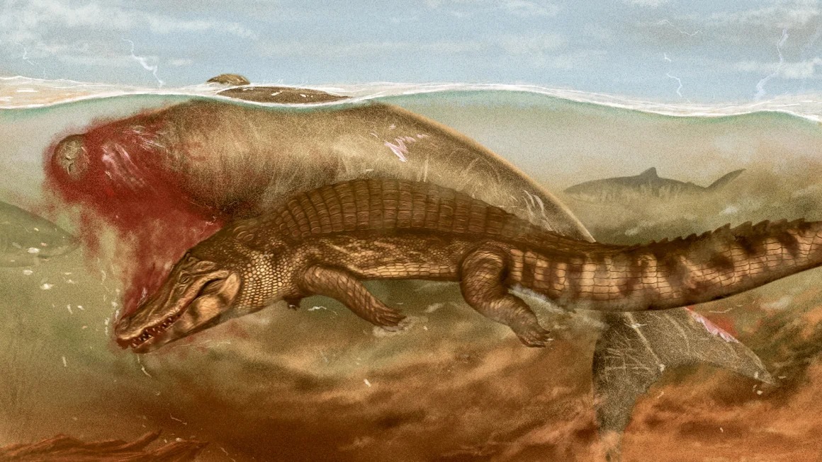 Το εξαφανισμένο σήμερα θηλαστικό, ένα σειρηνοειδές του γένους Culebratherium, συγγενικό με τους σημερινούς μανάτους, κολυμπούσε στη θάλασσα πριν από 15 εκατομμύρια χρόνια όταν έγινε στόχος ενός κροκόδειλου και ενός καρχαρία.