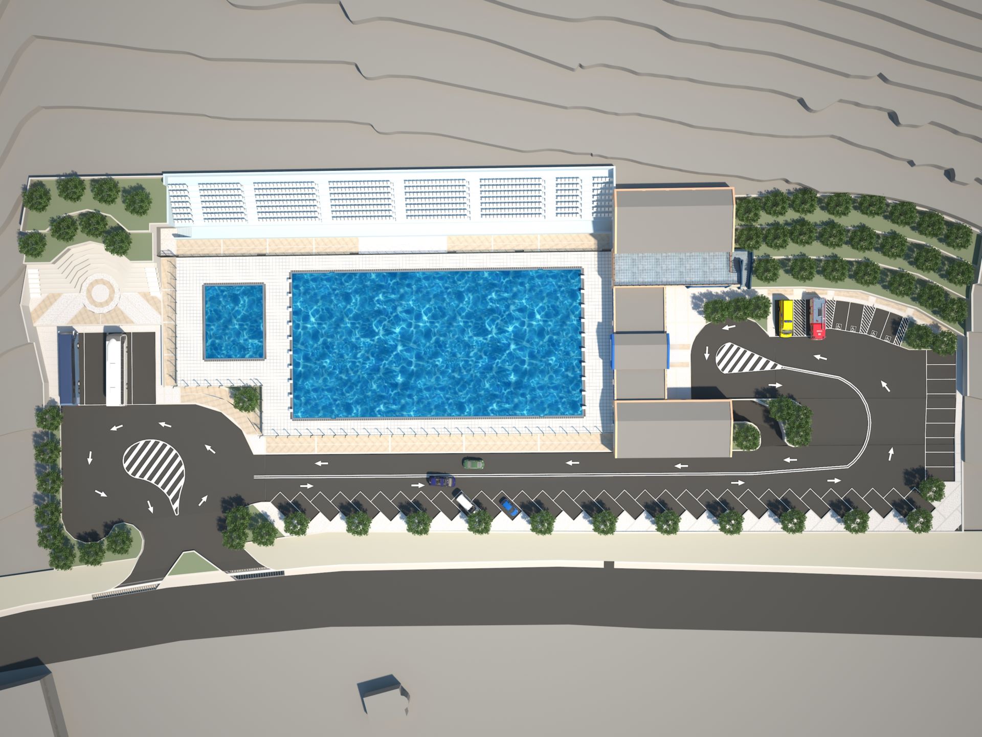 καθώς και τη διαμόρφωση του περιβάλλοντα χώρου και των θέσεων στάθμευσης.