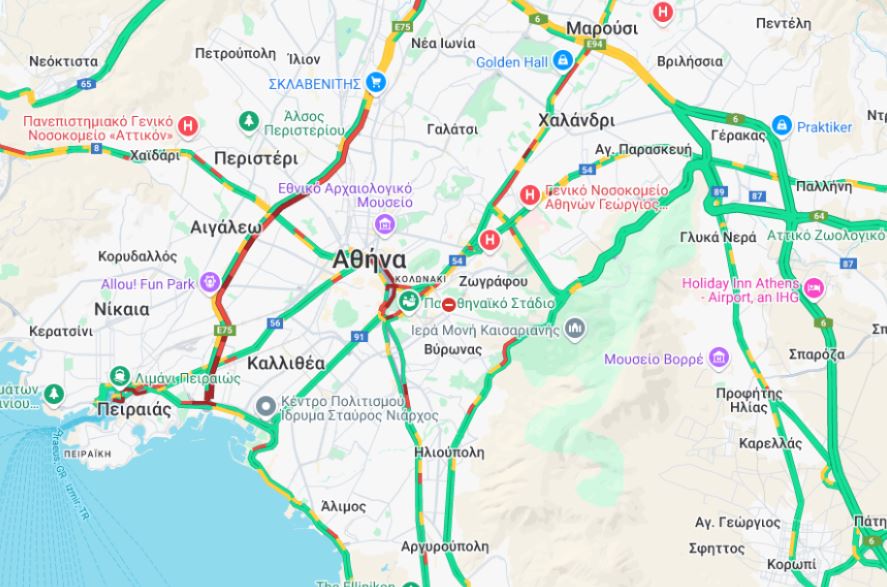 Παράλληλα, αυξημένη ροή παρατηρείται και στους κεντρικούς άξονες της Αθήνας, όπως Αλεξάνδρας, Μεσογείων, άνοδος της Λ. Κηφισίας, Βασ. Σοφίας, Σταδίου και Φιλελλήνων.