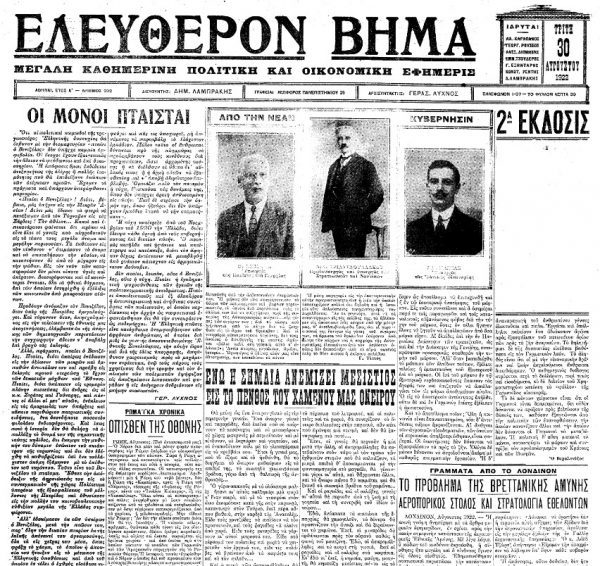 Αλλά, πράγματι, πταίει ο Βενιζέλος. Πταίει, διότι ακαίρως ενέδωσεν εις την αξίωσιν των μικρών και εμπαθών αντιπάλων του και προέβη εις εκλογάς προτού στερεώση το έργον των δεκαετών μόχθων του Έθνους. Πταίει, διότι υπέπεσεν εις τρομεράν πλάνην πιστεύσας ότι άνδρες ως οι κ.κ. Στράτος και Γούναρης, και πάντες οι άλλοι οι μετ’ αυτών, ενέκλειον εις τας αμαρτωλάς των υπάρξεις και κάποιο περιθώριον πατριωτικής συνειδήσεως, ένα οσονδήποτε ποσοστόν φιλολάου ενδιαφέροντος. Και ίσως ποτέ η ιστορία δεν θα θελήση να απαλλάξη το όνομά του της σημαντικής ταύτης κηλίδος, ότι έκαμψε την μυθικήν του δύναμιν ενώπιον του σκιάχτρου της τυραννίας και ότι δεν εδέχθη να καθυβρίζεται επί ένα τουλάχιστον ακόμη εξάμηνον με το επίθετον του τυράννου. Τούτο είνε του Βενιζέλου το πταίσμα. Έθεσε την απόδειξιν της αφοσιώσεώς του εις το συνταγματικόν της χώρας Πολίτευμα υπεράνω της εξασφαλίσεως του μέλλοντος της Πατρίδος και εθυσίασεν εις την πολλήν του κοινοβουλευτικήν ευθιξίαν μεγάλα της Ελλάδος συμφέροντα.