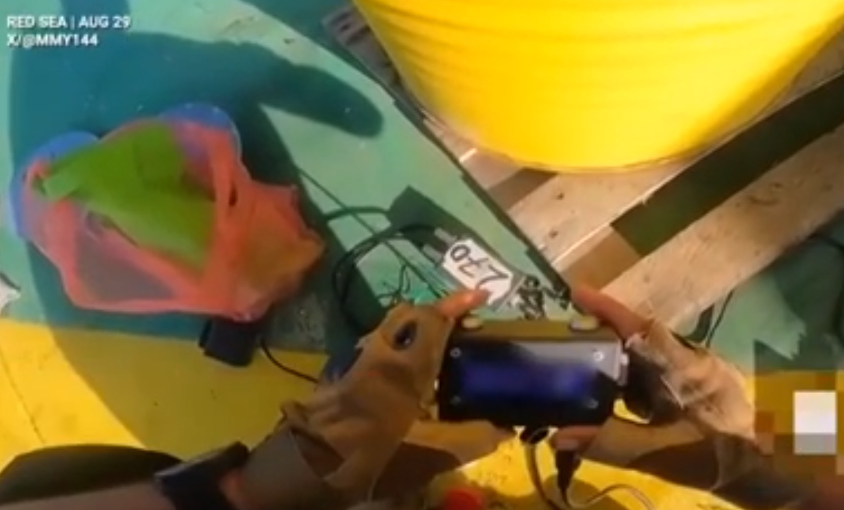 Στο συγκεκριμένο βίντεο φαίνονται μαχητές των Χούθι να τοποθετούν εκρηκτικούς μηχανισμούς πάνω στο πλοίο. Ακούγονται να φωνάζουν: «Θάνατος στην Αμερική και το Ισραήλ. Νίκη στο Ισλάμ».