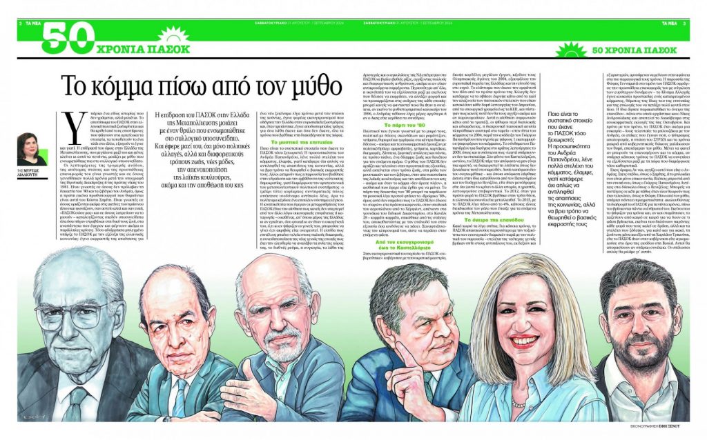 Κακό χωριό τα λίγα σπίτια; Για κάποια χρόνια, το ΠΑΣΟΚ απασχολούσε περισσότερο με την τοξικότητα των εσωτερικών διαμαχών παρά με την πολιτική του παρουσία – στελέχη της νεότερης γενιάς βρήκαν σπίτι στους αντιπάλους του, εκ δεξιών και εξ αριστερών, αρνούμενοι να μείνουν στην αφάνεια στα πιο παραγωγικά τους χρόνια. Η παρουσία της Φώφης Γεννηματά στο τιμόνι του ΠΑΣΟΚ σφράγισε την προσπάθεια επαναφοράς του με σύγκλιση των ευρύτερων δυνάμεων – το Κίνημα Αλλαγής έγινε κουκούλι προστασίας ενός καταχρεωμένου κόμματος, θύματος της ίδιας του της επιτυχίας και της επιλογής του να πετάξει πολύ κοντά στον ήλιο. Η ίδια άφησε παρακαταθήκη το όνειρο της επανόδου – πάνω στο οποίο εργάστηκε και ο Νίκος Ανδρουλάκης και αποτελεί το διακύβευμα στις εσωκομματικές εκλογές της 6ης Οκτωβρίου. Και χρόνο με τον χρόνο, το ΠΑΣΟΚ έχει ακόμα μια ευκαιρία – ίσως τελευταία: τα μπλουζάκια με τον Ανδρέα, οι ατάκες που έγιναν ποπ, ο ψύχραιμος απολογισμός, η πτώση του ΣΥΡΙΖΑ και τα χρόνια μακριά από κυβερνητικούς θώκους μαλάκωσαν τον θυμό, επανέφεραν τον μύθο. Μένει να φανεί αν μπορούν να επαναφέρουν και το κόμμα, αν υπάρχει κάποιος τρόπος το ΠΑΣΟΚ να συνεχίσει να εξελίσσεται μαζί με τη χώρα που διαμόρφωσε τόσο καθοριστικά.
