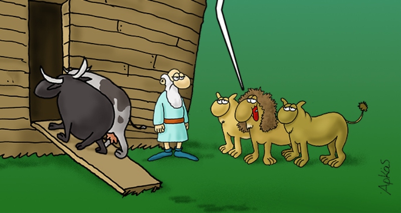 Στη σημερινή του «καλημέρα» σκιτσάρει ξανά την κιβωτό του Νώε και με τρόπο ευφάνταστο και απόλυτα χιουμοριστικό. Εκεί βλέπουμε ένα λιοντάρι που στο πλευρό του έχει δύο λιονταρίνες, οι οποίες περιμένουν να επιβιβαστούν και οι τρεις τους.