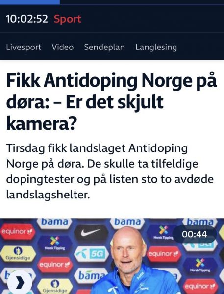 Την απίστευτη ιστορία αποκάλυψε ο εκλέκτορας των Σκανδιναβών, Στάλε Σολμπάκεν. «Εχετε κάποια κρυμμένη κάμερα;» ρώτησε τους ελεγκτές όταν συνήλθε από το σοκ. Αρκετοί διεθνείς νορβηγοί υποβλήθηκαν σε αντιντόπινγκ τεστ ενόψει των αγώνων για το Nations League.
