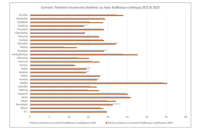 Στην Ελλάδα το ποσοστό της στεγαστικής δαπάνης σε σχέση με το διαθέσιμο εισόδημα είναι ούτως ή άλλως το υψηλότερο στην Ευρώπη. Το 2023 κατέγραψε αύξηση, ξεπερνώντας το 35%.