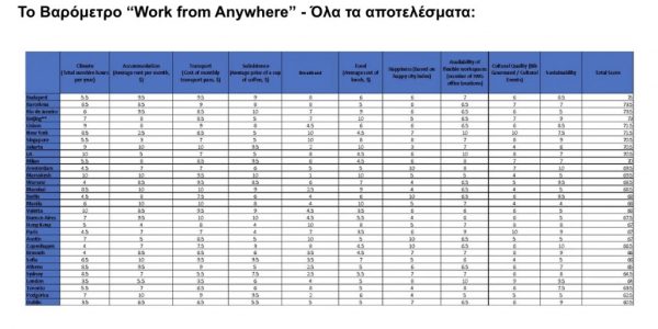 Με ένα δίκτυο που ξεπερνά τις 4.000 ευέλικτες τοποθεσίες γραφείων σε πάνω από 120 χώρες, η IWG συνέταξε το δεύτερο ετήσιο Βαρόμετρο “Work from Anywhere”, αξιολογώντας 30 κορυφαίες πόλεις ως ιδανικούς προορισμούς για workation. Η αξιολόγηση βασίστηκε σε 10 κριτήρια, όπως το κλίμα, ο πολιτισμός, η διαμονή, οι συγκοινωνίες, η γαστρονομία, η ευεξία, η ταχύτητα του internet, η βιωσιμότητα και η διαθεσιμότητα ευέλικτων χώρων εργασίας, με κάθε πόλη να βαθμολογείται σε κλίμακα 1-10.