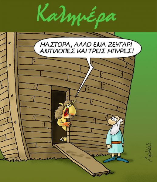 Στη σημερινή του έμπνευση ο γνωστός σκιτσογράφος μας δείχνει τον Νώε που κάθεται έξω από την Κιβωτό, όταν πετάγεται από την πόρτα ένα λιοντάρι και του φωνάζει: «Μάστορα, άλλο ένα ζευγάρι αντιλόπες και τρεις μπύρες». Όλα τα λεφτά, το γεμάτο έκπληξη βλέμμα του Νώε, που δεν κατάλαβε από που του ήρθε η ατάκα.