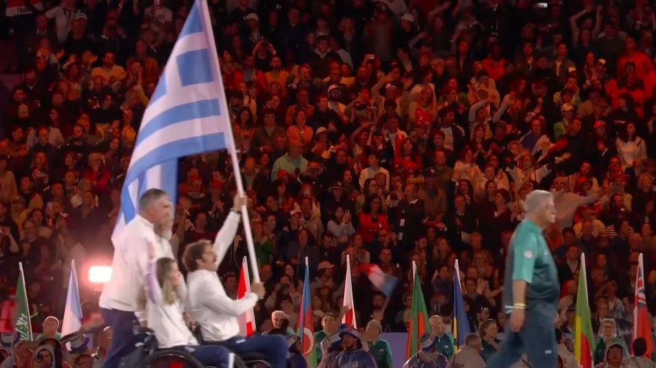 Με την ελληνική σημαία, η Αλεξάνδρα Σταματοπούλου και ο Αντώνης Τσαπατάκης, ως σημαιοφόροι της χώρας μας, έκαναν μια εντυπωσιακή είσοδο στο Stade de France, κατά τη διάρκεια της τελετής λήξης των Παραολυμπιακών Αγώνων του Παρισιού.