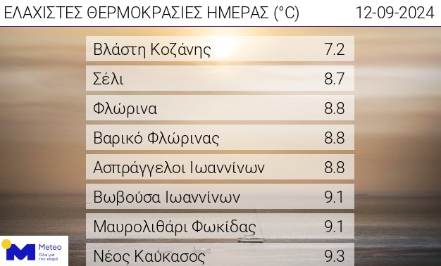 Συγκεκιρμένα, σύμφωνα με το δίκτυο αυτόματων μετεωρολογικών σταθμών του meteo.gr / Εθνικού Αστεροσκοπείου Αθηνών, μονοψήφιες ελάχιστες θερμοκρασίες καταγράφηκαν τις πρωινές ώρες της Πέμπτης 12/09.