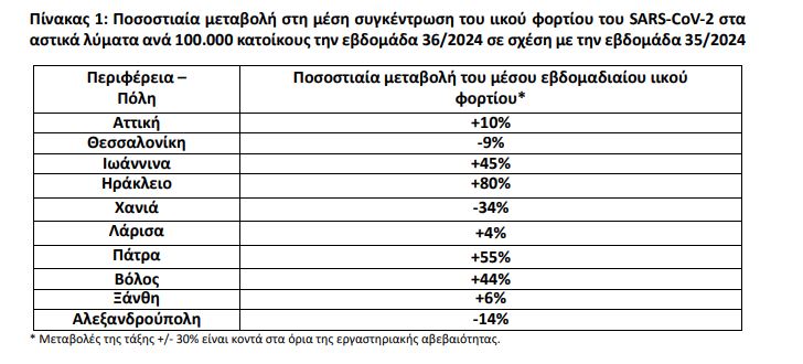 Αύξηση του ιικού φορτίου καταγράφηκε στα λύματα τεσσάρων από τις δέκα πόλεις που εξετάζονται, σύμφωνα με τον παρακάτω πίνακα: