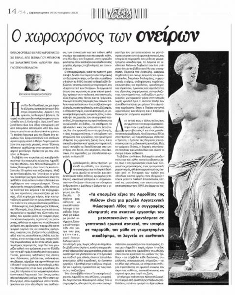 *Αποσπάσματα από άρθρο του Κώστα Γεωργουσόπουλου, που έφερε τον τίτλο «Ο χωροχρόνος των ονείρων» και ήταν αφιερωμένο στον Νάνο Βαλαωρίτη και στο βιβλίο του «Τα σπασμένα χέρια της Αφροδίτης της Μήλου» (εκδόσεις Άγρα, 2002). Το κείμενο του Γεωργουσόπουλου είχε δημοσιευτεί στην εφημερίδα «Τα Νέα» το Σαββατοκύριακο 29-30 Νοεμβρίου 2003.
