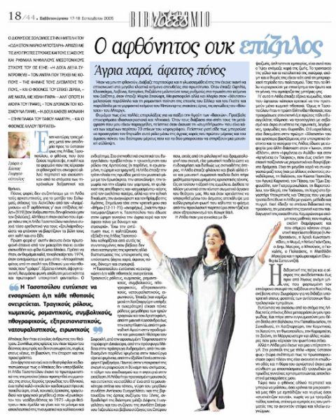 Λίγες ημέρες μετά το θάνατό της, ο Κώστας Γεωργουσόπουλος —στην απαράμιλλη γραφίδα του προστρέχουμε και πάλι σήμερα— είχε αποχαιρετήσει την Τασοπούλου μέσα από τις στήλες του στην εφημερίδα «Τα Νέα». Το σχετικό άρθρο του, που έφερε τον τίτλο «Ο αφθόνητος ουκ επίζηλος», είχε δημοσιευτεί στο φύλλο που είχε κυκλοφορήσει το Σαββατοκύριακο 17-18 Σεπτεμβρίου 2005.