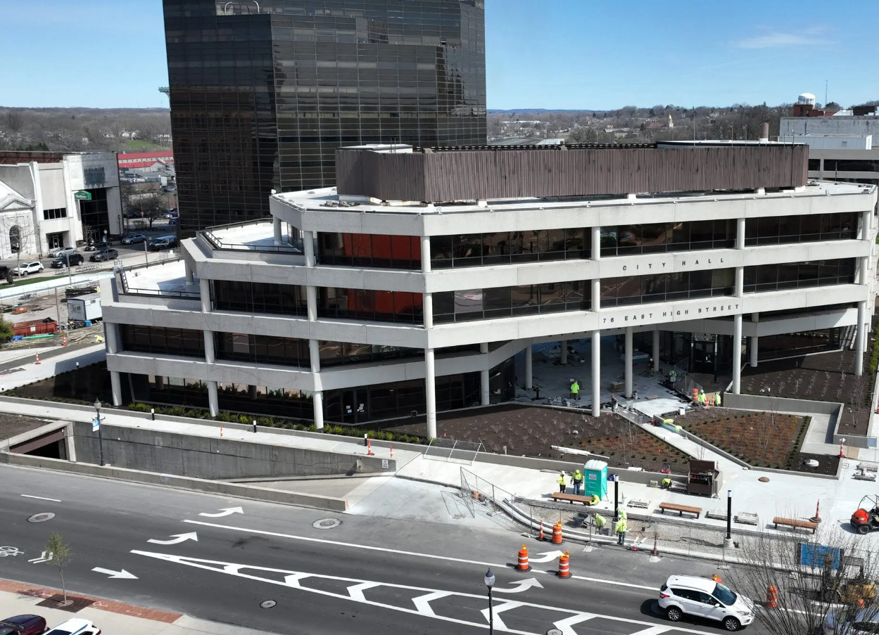 Πολλά περιπολικά ήταν σταθμευμένα έξω από το δημαρχείο, αλλά δεν υπήρχε κάποια ένδειξη αναστάτωσης στο σημείο.
