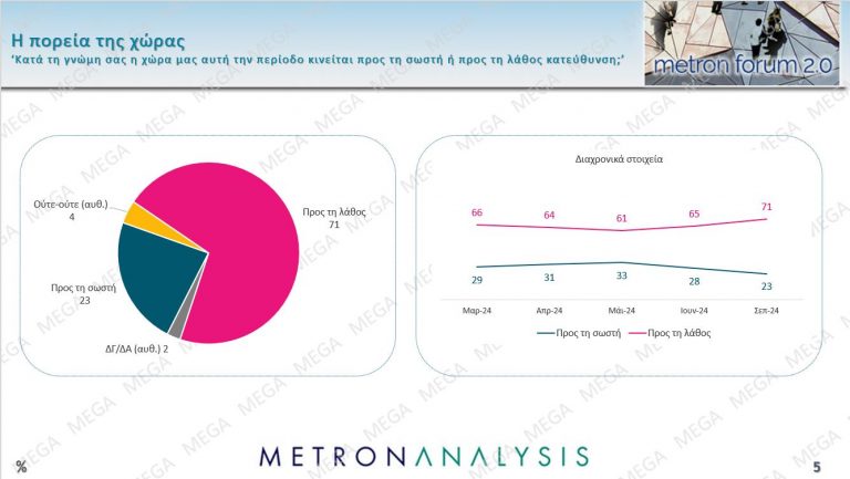 Η μεγάλη δημοσκόπηση της Metron Analysis για λογαριασμό του MEGA αποτυπώνει τη φθορά της ΝΔ από την κοινωνική δυσαρέσκεια με αιχμή την ακρίβεια. Η αύξηση της κοινωνικής δυσαρέσκειας αποτυπώνεται καταρχάς στην απάντηση στο ερώτημα εάν η χώρα κινείται προς τη σωστή ή τη λάθος κατεύθυνση. Και αυτό γιατί το 71% απαντούν ότι κινείται προς τη λάθος κατεύθυνση (από 65% τον Ιούνιο) και μόλις το 23% αναφέρει ότι κινείται στη σωστή κατεύθυνση (από 28% τον Ιούνιο).