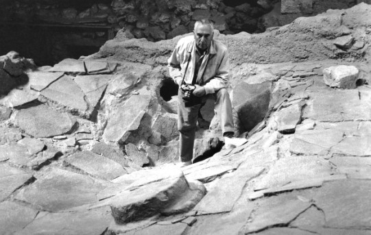 Στην κεντρική φωτογραφία εικονίζεται ο Μαρινάτος στον αρχαιολογικό χώρο του Ακρωτηρίου Θήρας το 1969.