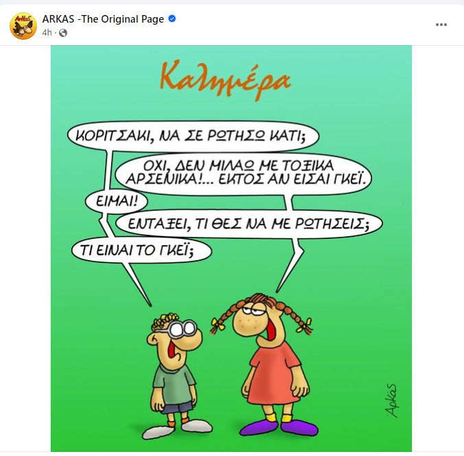 Στο σημερινό νέο σκίτσο του Αρκά εμφανίζονται τα δύο παιδιά, η Ρόζα και ο Απόστολος. Όταν το αγόρι απευθύνεται στο κορίτσι εκείνη του απαντά ότι δε μιλά σε τοξικά αρσενικά. Το μόνο περιθώριο που του αφήνει για να της απευθύνει το λόγο είναι αν ο ίδιος είναι γκέι.