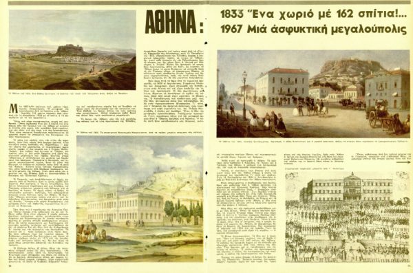 Η πόλη που κέρδιζε τότε τον τίτλο της κορυφαίας ήταν ένας σωρός από άσχημα ερείπια. Λίγα σπιτάκια στους πρόποδες της Ακροπόλεως — εκατόν εξήντα δύο χαμοκέλλες (σ.σ. χαμόσπιτα, φτωχικά σπίτια χτισμένα από ευτελή υλικά), οι περισσότερες χωρίς σκεπή, γράφει σ’ ένα κείμενό του ο Σπύρος Μελάς. Ακόμη: ένα παζάρι που έχτισαν οι Τούρκοι, κοπρώνας (σ.σ. υπαίθριος χώρος αφόδευσης ή εναπόθεσης κοπριάς και ακαθαρσιών) τότε, μ’ ένα ρολόι υψωμένο στη μέση του, ευγενικιά χειρονομία του λόρδου Ελγίνου στους Αθηναίους, σ’ αντάλλαγμα της μετόπης του Παρθενώνα που αφαίρεσε. Παρακάτω ο Μεντρεσές (σ.σ. μουσουλμανικό ιεροδιδασκαλείο) και λιγοστά μουσουλμανικά τεμένη ήσαν τα μόνα που έδειχναν το ανθρώπινο πέρασμα κάτω από τη σκιά του Βράχου. Κανένα ίχνος τοπικής προσωπικότητας, μόνο τσεκουριές από βάρβαρα περάσματα πάνω στο μέτωπο της πόλεως. Στον τόπο αυτόν των ερειπίων και της θλίψεως ήρθε κι εγκαταστάθηκε η διοίκηση του Ελληνικού Κράτους.