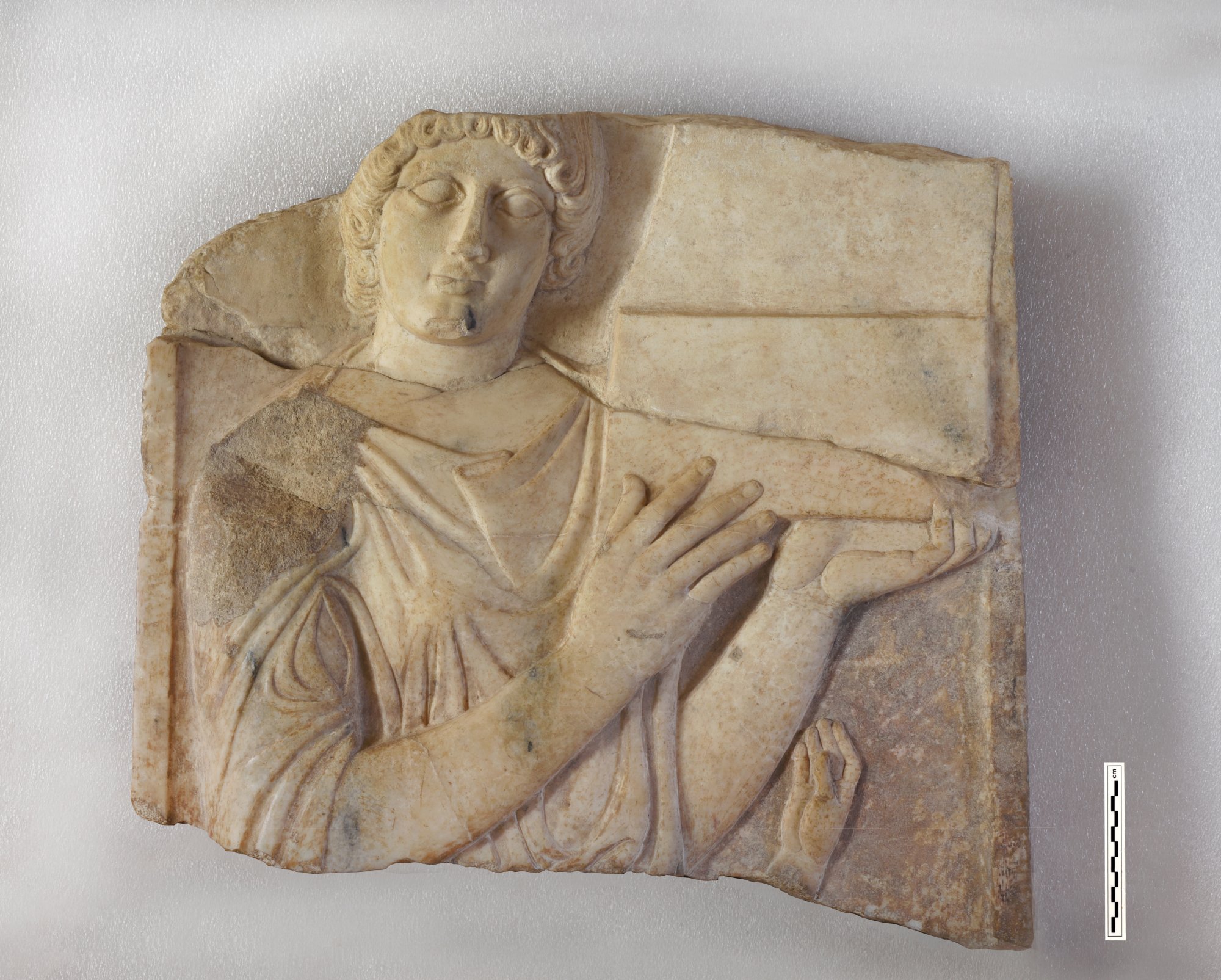 1.Τμήμα μαρμάρινης επιτύμβιας στήλης, ύψους 0,55μ. και πλάτους 0,60μ. Εικονίζεται σε επίπεδο ανάγλυφο μετωπική γυναικεία μορφή, η οποία κρατά και με τα δύο της χέρια κοσμηματοθήκη με ανοιχτό κάλυμμα. Χαμηλότερα στην παράσταση σώζεται το δεξί χέρι μικρότερης σε κλίμακα μορφής, αναμφίβολα παιδικής.