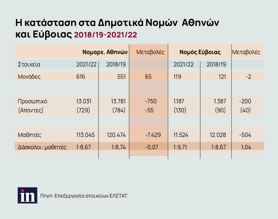 Πράγματι, στα Δημοτικά Σχολεία της Νομαρχίας Αθηνών οι διδάσκοντες μειώθηκε σε σχέση με το 2018/19 κατά 750 άτομα, αλλά την ίδια περίοδο οι σχολικές μονάδες μειώθηκαν κατά … 65 και ο μαθητικός πληθυσμός κατά 7.429 άτομα. Αυτό είχε ως συνέπεια να βελτιωθεί οριακά και στα Δημοτικά Σχολεία της Νομαρχίας Αθηνών η σχέση διδάσκοντος προς μαθητές και, πάντως, δεν επιδεινώθηκε, όπως στα Δημοτικά Σχολεία των Νομών Ευβοίας, Αχαϊας και Κορίνθου.