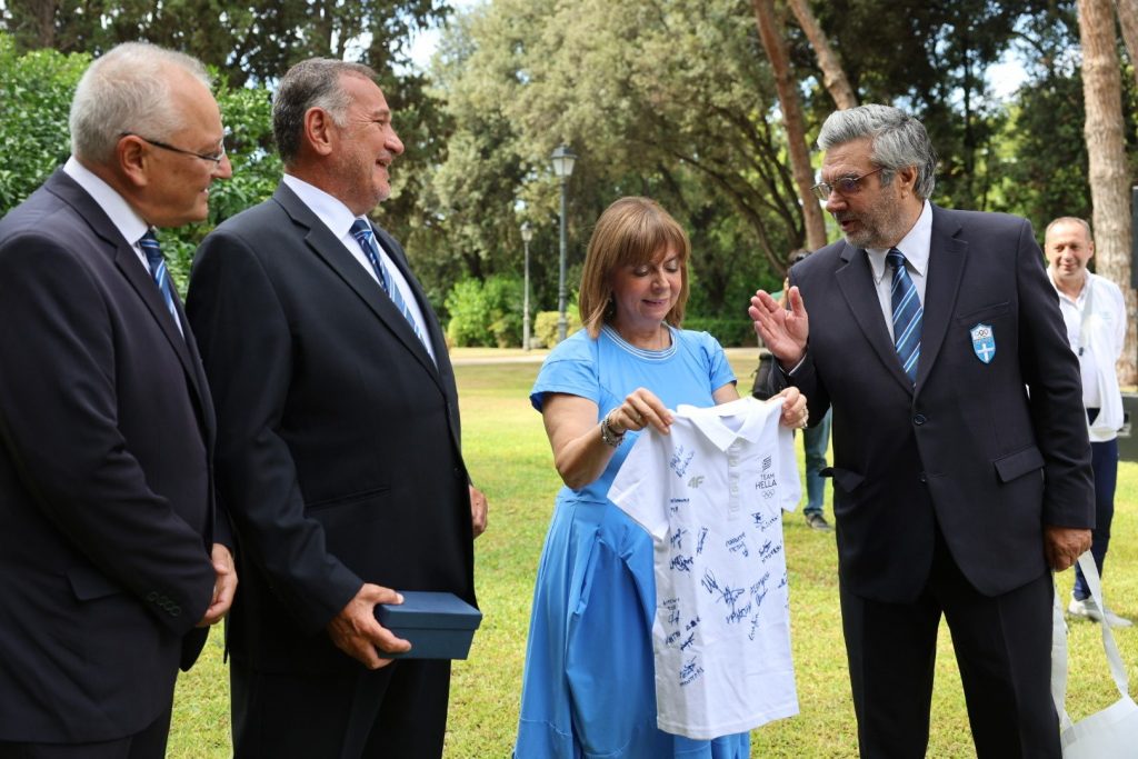 Στο τέλος η κα Σακελλαροπούλου πήρε στα χέρια της ένα δώρο από τον Αρχηγό Αποστολής στο Παρίσι Πέτρο Συναδινό, μία μπλούζα της ελληνικής ομάδας με τις υπογραφές όσων πήραν μετάλλιο στους Ολυμπιακούς Αγώνες, αλλά και από άλλα μέλη της Team Hellas, με την Πρόεδρο της Δημοκρατίας να λέει χαρακτηριστικά: «Θα την βάλω σε κορνίζα!»