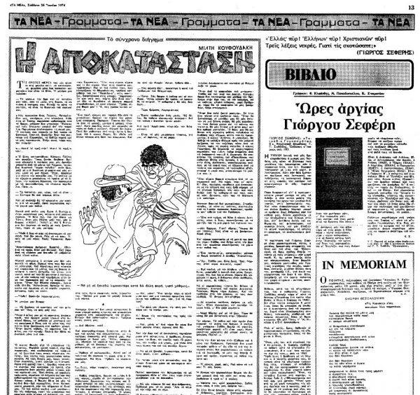 * Απόσπασμα από άρθρο του δημοσιογράφου, κριτικού και μεταφραστή Κώστα Σταματίου (1929-1991), που έφερε τον τίτλο «Ώρες αργίας Γιώργου Σεφέρη» και είχε δημοσιευτεί στην εφημερίδα «Τα Νέα» το Σάββατο 26 Ιουνίου 1976.