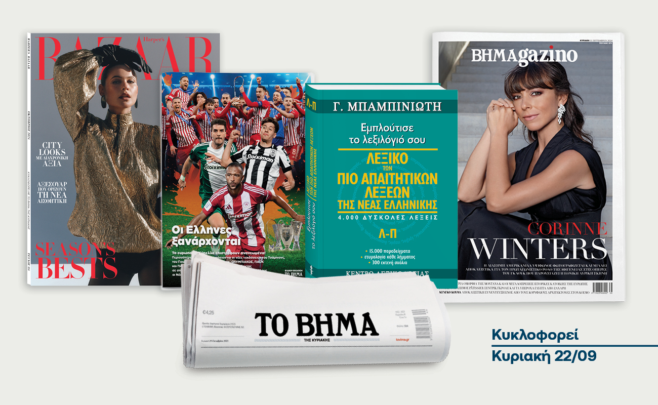 Το «Βήμα της Κυριακής» κυκλοφορεί μαζί τον 3ο τόμο του Λεξικού των πιο Απαιτητικών Λέξεων της Νέας Ελληνικής, την ειδική έκδοση «Οι Έλληνες Ξανάρχονται», το Harper’s Bazaar και το ΒΗΜΑgazino. Αυτή την Κυριακή στις 22 Σεπτεμβρίου.