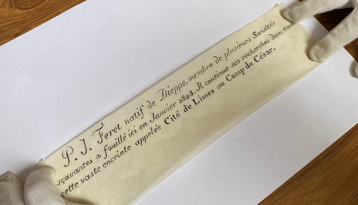 Το σημείωμα γράφτηκε από τον αρχαιολόγο P.J. Féret, ο οποίος διεξήγαγε ανασκαφή στην τοποθεσία Cité de Limes τον Ιανουάριο του 1825. Όταν άνοιξαν το μήνυμα, είδαν ότι έγραφε: «Ο P.J Féret, γέννημα θρέμμα της Διέππης, μέλος διαφόρων πνευματικών εταιρειών, πραγματοποίησε ανασκαφές εδώ τον Ιανουάριο του 1825. Συνεχίζει τις έρευνές του σε αυτήν την τεράστια περιοχή γνωστή ως Cité de Limes ή Στρατόπεδο του Καίσαρα».