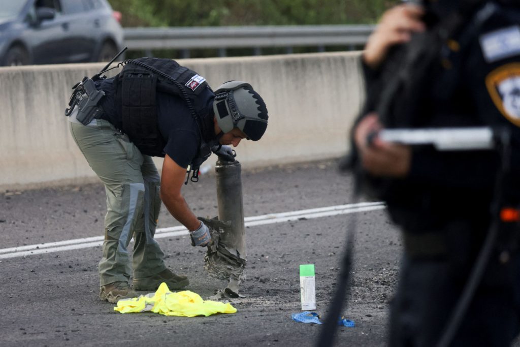 Ισραηλινός αστυνομικός μαζεύει υπόλειμμα ρουκέτας στο βόρειο Ισραήλ.