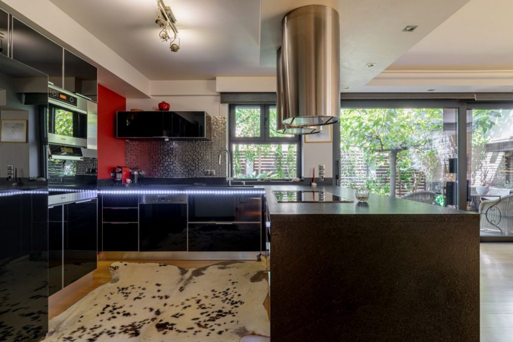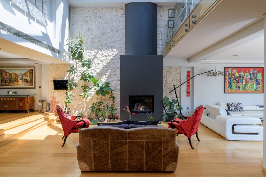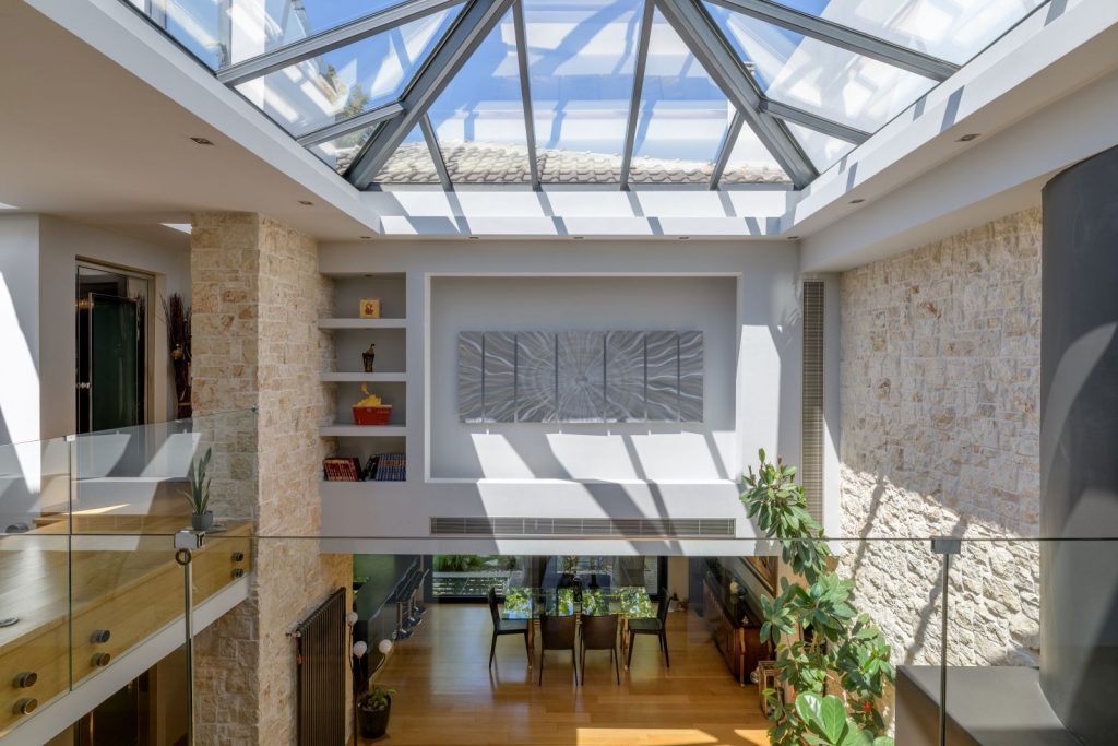 Στο ισόγειο θα βρείτε ένα μεγάλο σαλόνι με ενεργειακό τζάκι, ιδανικό για βραδιές χαλάρωσης, και μια open plan κουζίνα που πλημμυρίζει με φυσικό φως χάρη στο εντυπωσιακό skylight. Το φως αυτό δημιουργεί μια ζεστή και φωτεινή ατμόσφαιρα, καθ’ όλη τη διάρκεια της ημέρας.