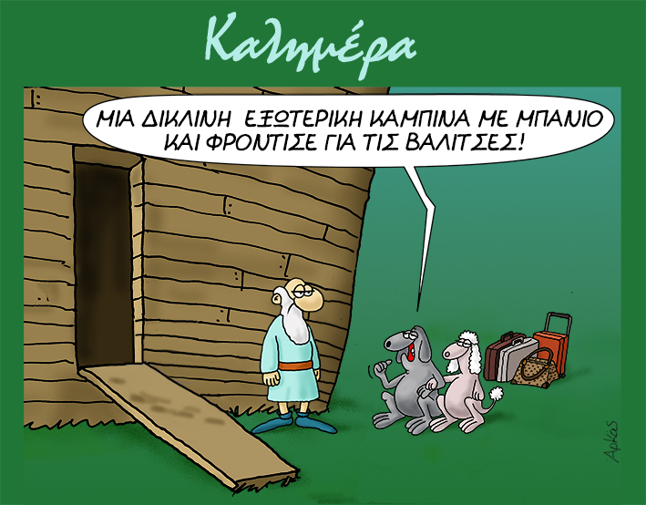 Στο σημερινό σκίτσο του ο Αρκάς μεταμορφώνει τον Νώε σε γκρουμ και την κιβωτό σε κρουαζιερόπλοιο, καθώς ένα luxury ζευγάρι ζώων φτάνει στην είσοδο και το αρσενικό λέει: «Μια δίκλινη εξωτερική καμπίνα με μπάνιο και φρόντισε για τις βαλίτσες».