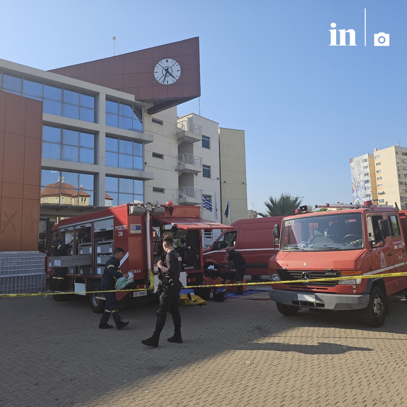 Όπως φαίνεται και στις φωτογραφίες του in, ο εξωτερικός χώρος του δημαρχείου έχει αποκλειστεί από τις δυνάμεις της Πυροσβεστικής και της ΕΛ.ΑΣ.